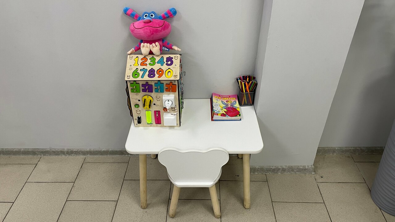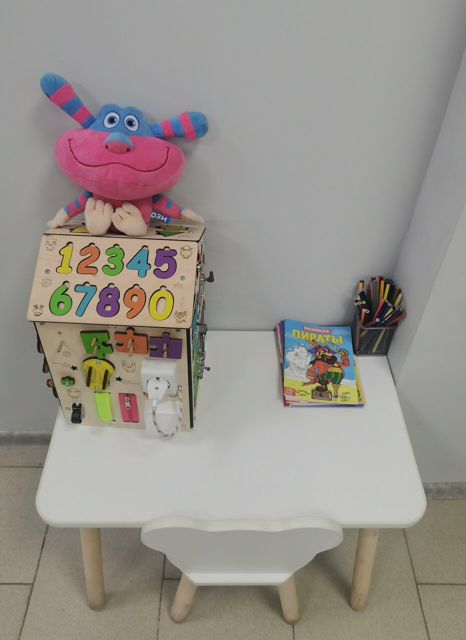 - Детский уголок с раскрасками и бизибордом.