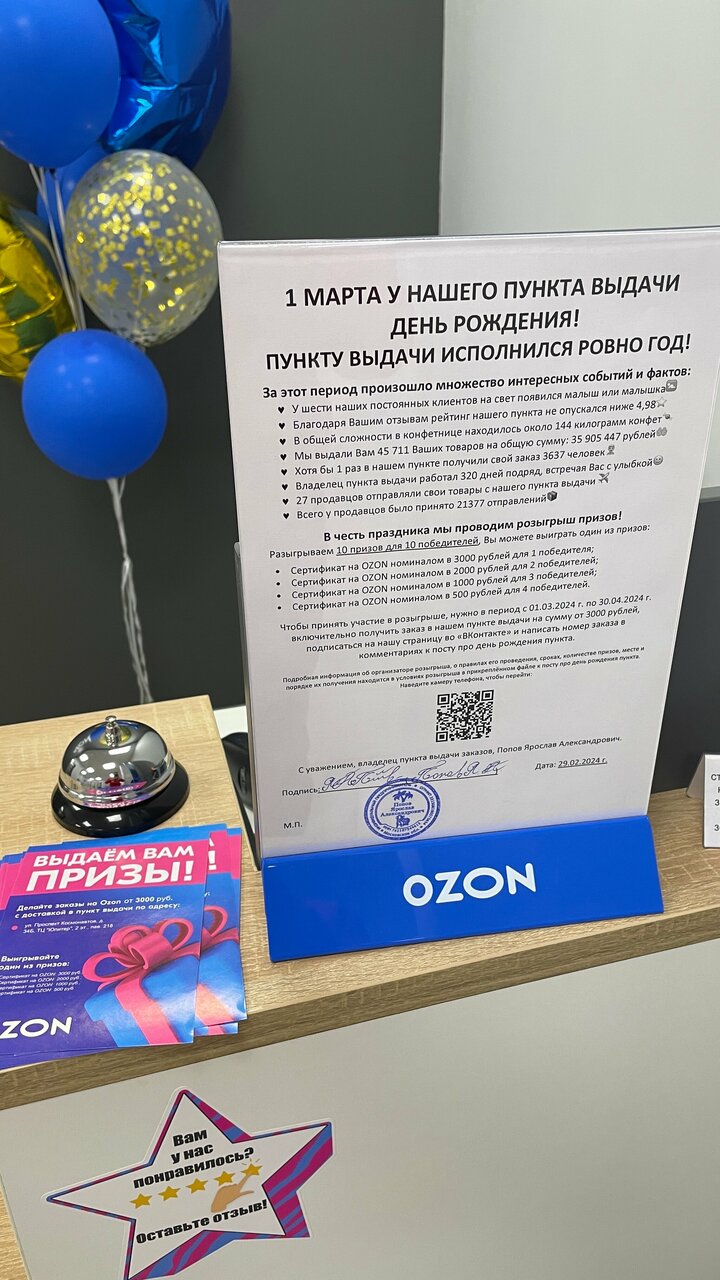 Лучший озон! Чистый, светлый, просторный. Всегда предложат конфеты (прям скажут «угощайтесь») и бесплатный пакет. Очень вежливые сотрудницы и владелец пвз Ярослав. После посещения этого пункта Озон даже настроение улучшается, очень милый персонал, прям няшечки. Стоит большущее долларовое дерево из растений, детский столик с карандашами, кулер с водой, вазочка с конфетками, розыгрыши проводятся. Видно, что к делу подходят с душой, и мы клиенты это видим. Не меняетесь, только улучшайтесь!