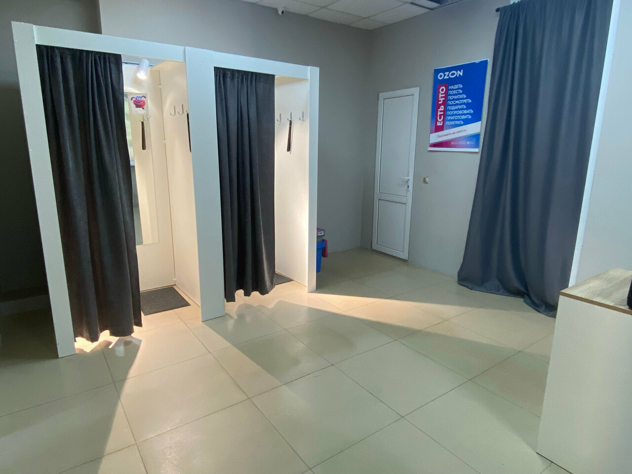 Есть пару кабинок для примерки одежды, место для сборки товаров, просторное помещение и приветливые сотрудники