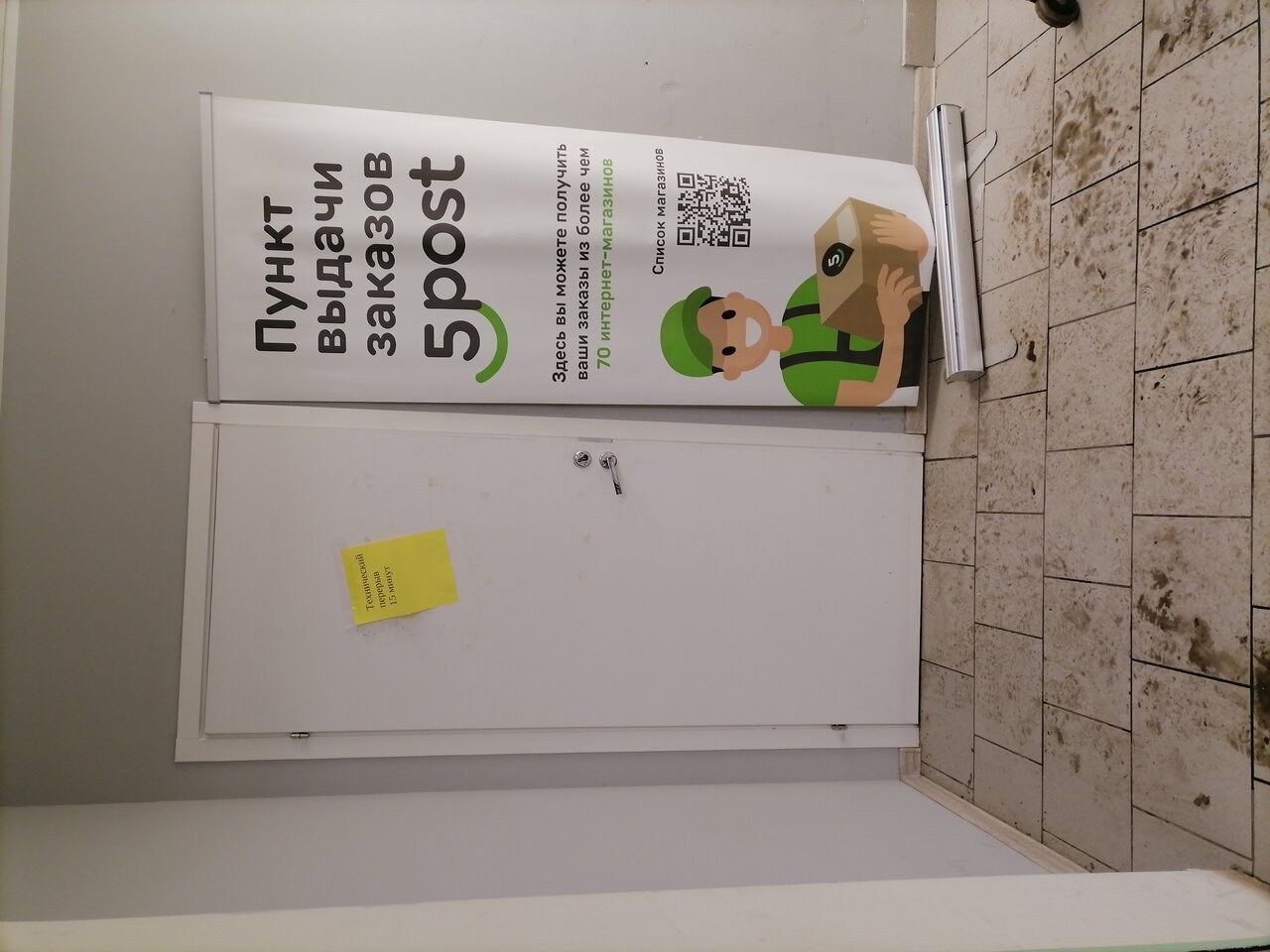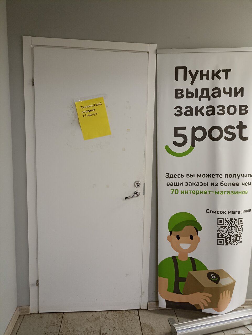 Сегодня 09.12.2022 пошла за заказом. На двери объявление ‘ТЕХНИЧЕСКИЙ ПЕРЕРЫВ 15 МИНУТ’ простояв 20 минут, и уже собралось несколько человек, охранник магазина ‘Пятёрочка’ в котором находится данный сообщает, что пункт сегодня не работает! Что сотрудник утром был, но заболел и ушёл. Всё мы люди, но неужели нельзя повесить на двери объявление, что у нет сегодня не работает, что бы люди не стояли и не ждали??? Мы совершенно не заслуживаем этого???