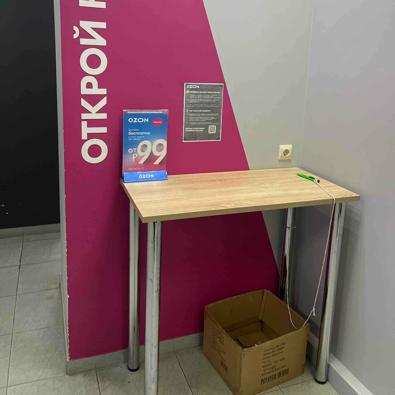 Пункт расположен в очень удобном месте Можно машиной подъехать,можно автобусом( остановка рядом).Очень хороший персонал.Советую пользоваться услугами данного пункта ‘Ozon’