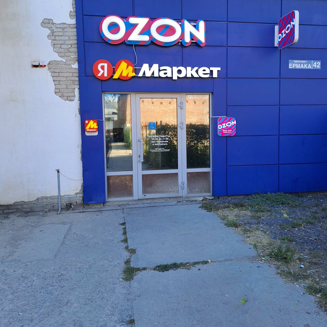 - Неухоженная территория у входа (сорняки, заброшенный вид).