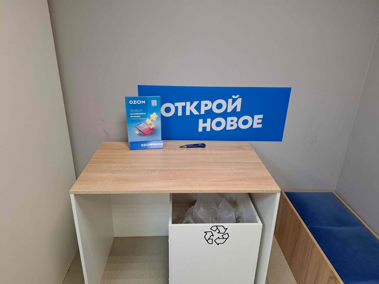 Был неплохой пункт, но теперь как ни придешь — длинная очередь и один человек на выдаче, который долго оформляет посылки в Boxberry. То есть, это пункт отправки посылок, а не Озон уже? Что-то на уровне почты России. Примерочная всего одна. Вторая завалена коробками.